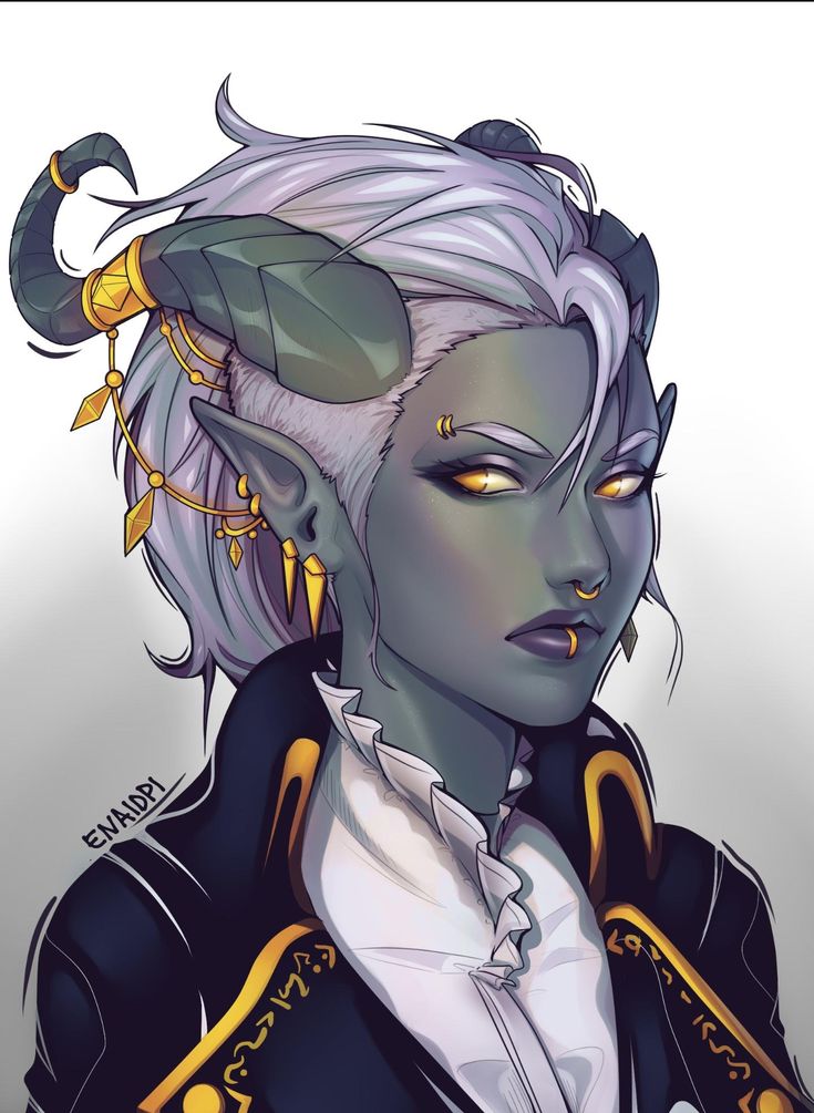 Description: Female; 5'7"; 42 years old; dark grey skin and horns with a purple hue or highlight to it; dark purple lips; bright yellow eyes (been called Golden Eyes); small frame but curvy build; shaved the side of her head near her horns and ears, and let the top grow out with different layers; tastefully draped in gold earrings, horn rings, nose and lip rings as well as ornate and delicate gold chains attaching her horns and earrings at certain spots. She dresses like a ship's captain (fake it until you make it, right?) with an enviably well-tailored coat; gold embellishments when possible; prefers dark blues, blacks and greys; an excellent pair of boots.