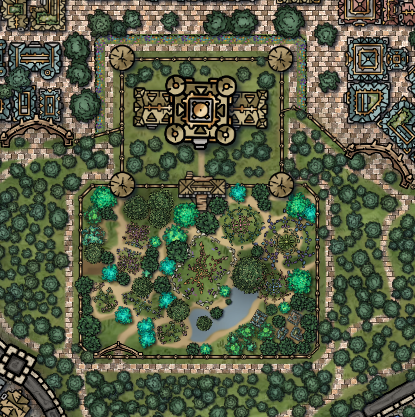 Hiding within a copse of trees and other flora is Spriggit's Grove, a temple dedicated to the sights, sounds, smells, and spirit of nature. Worshippers step inside the grove and the sounds of the city outside vanish, replaced instead with the twitter of birds and the rustle of leaves in the wind. This sacred space is a place where one can come and soak in the natural world for as long as they like.