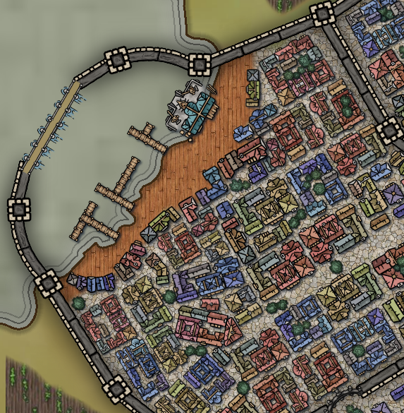 The Harbor District is home to the city's ports, where both cargo and passengers come and go to the Swiftide Sea via the Sterling Bay. Fishermen and tradesmen populate this district and sell their wares at wholesale prices to those who know whom and how to ask.